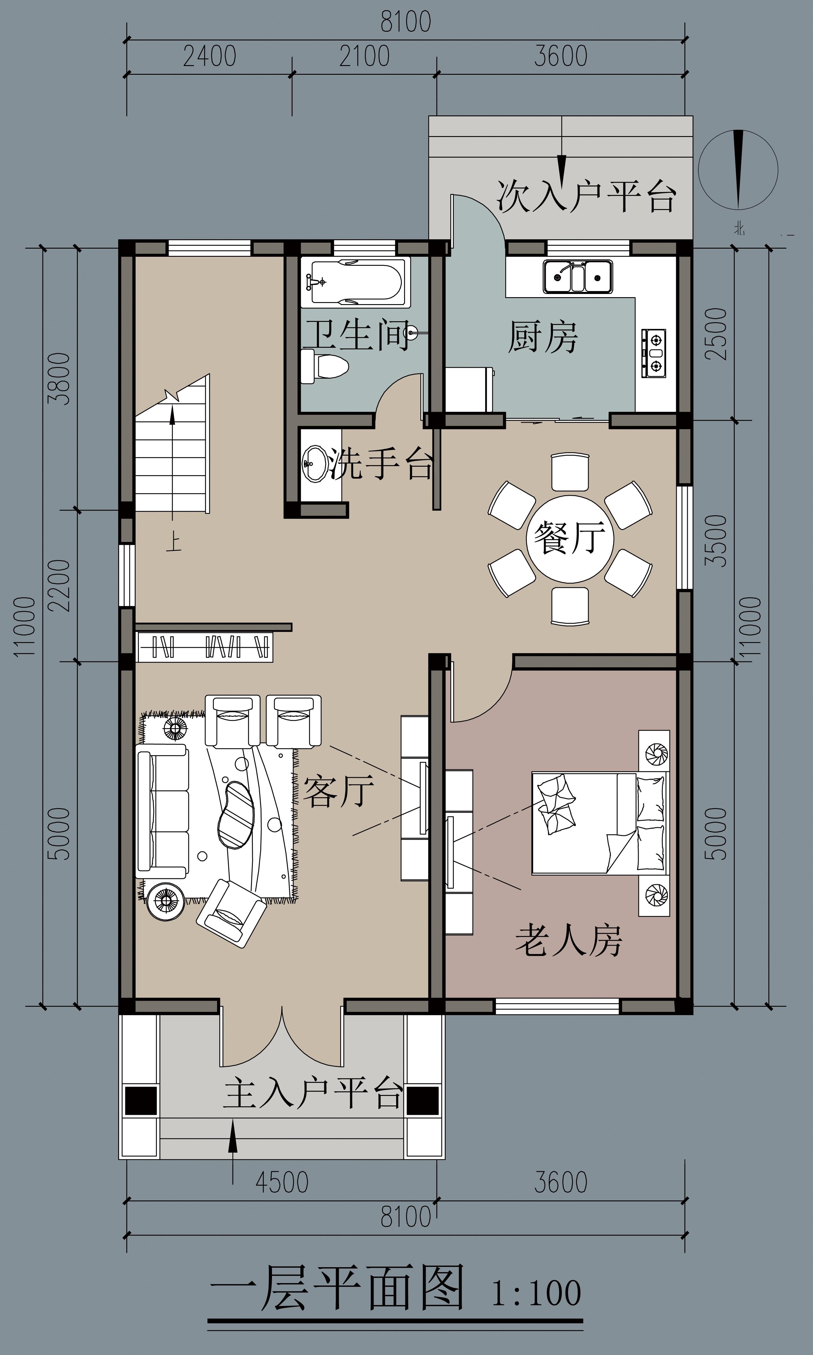 8*11的尺寸,占地是比較小的了。而且,室內的布局也很簡單,老人房和客廳都在向陽面,然后是廚房、餐廳和衛(wèi)生間。