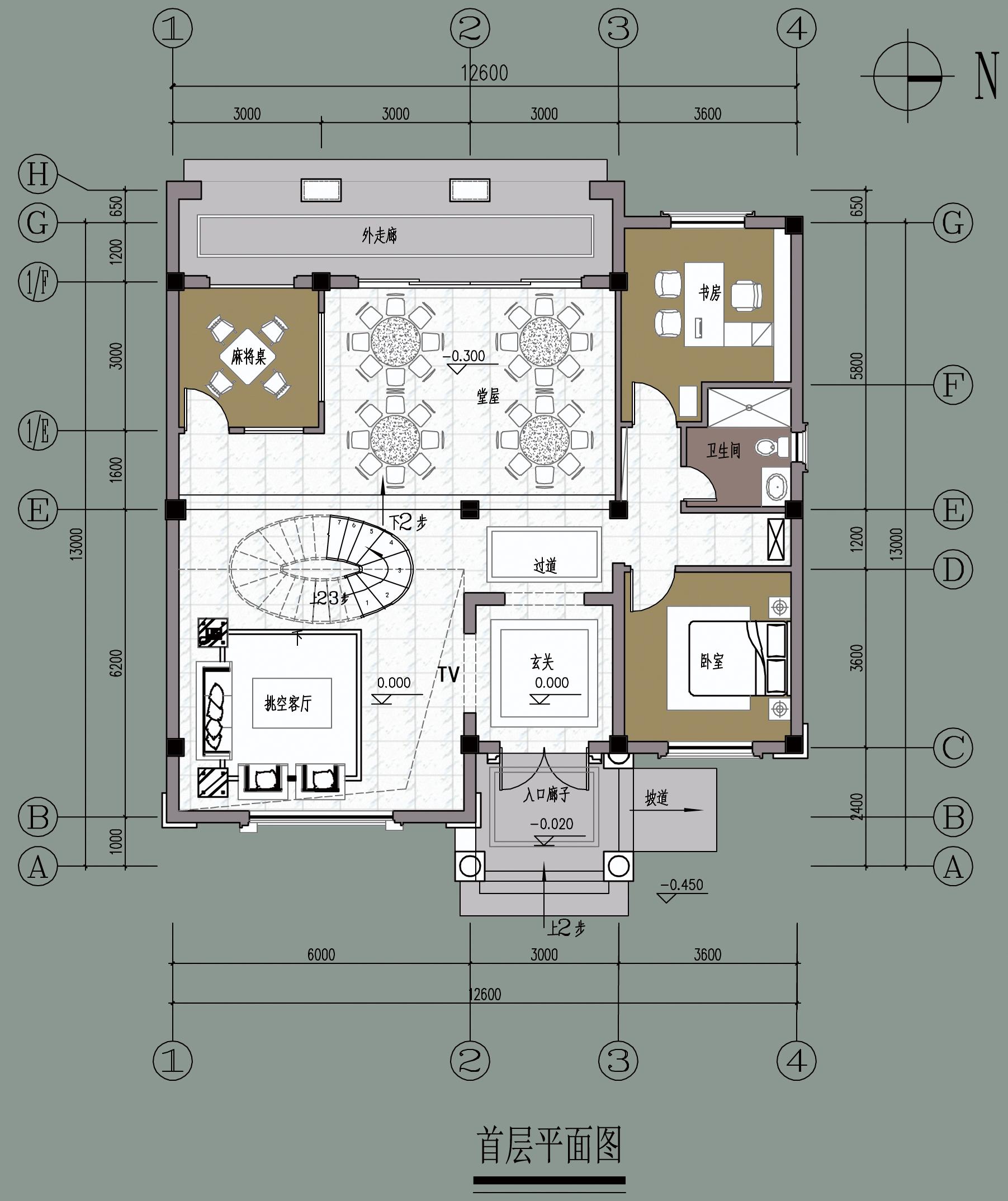 很明顯地看出,室內(nèi)的空間很寬敞。挑空的客廳和旋轉(zhuǎn)的樓梯都讓這棟別墅看起來很有檔次。臥室朝陽,適合老年人居住,書房在里間,很安靜。與別的房子不同的是,這棟別墅沒有設(shè)計廚房(可能是設(shè)計在室外單獨建造),所以堂屋里用作餐廳的空間就很大。