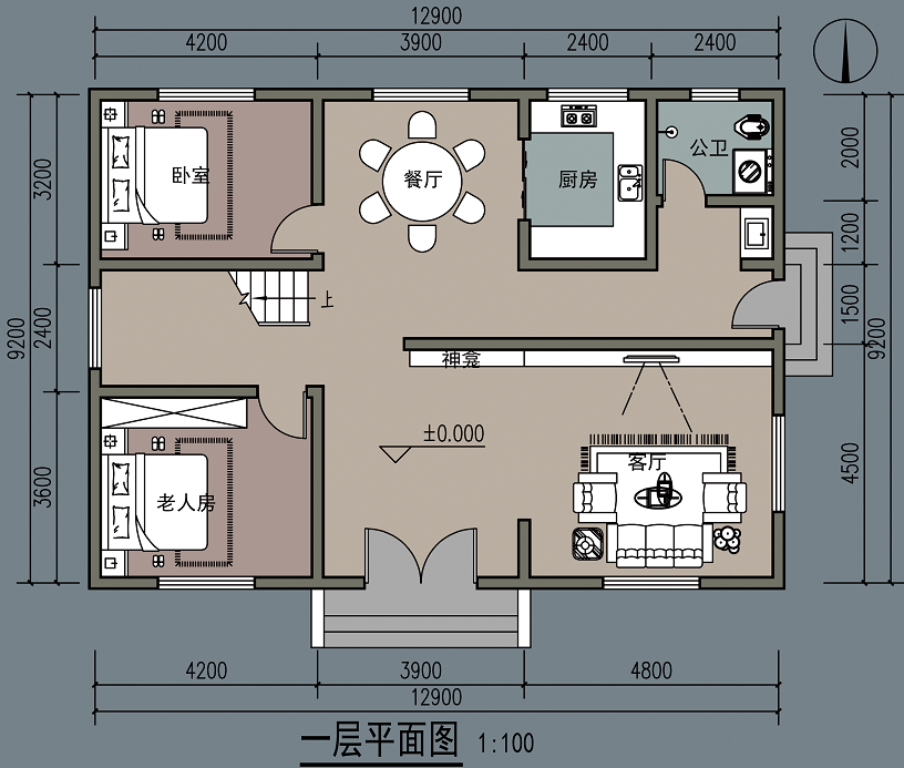 一層平面圖向陽面的是長輩臥室及客廳,都設計的是比較寬敞的布局,老人房長度在4.2米,與老人房相對的客臥也是這樣的寬度,房間的活動空間比較大,不那么狹窄,住著應該很舒服。廚房、餐廳、衛(wèi)生間在一條線上很整齊。