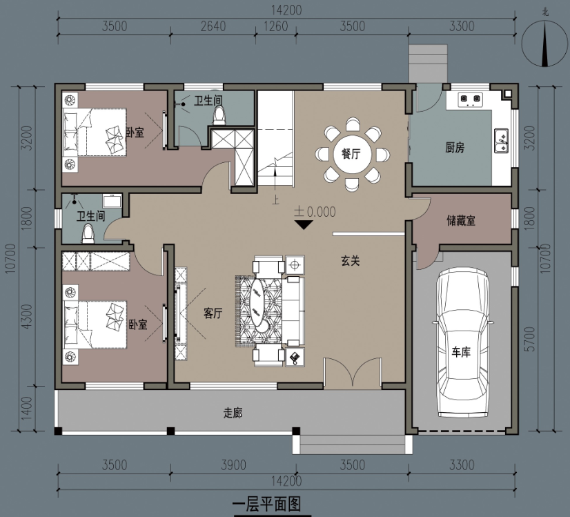 一層平面圖上看,除了客廳、餐廳、廚房+兩個臥室外,吸引人的還包括車庫,挨著儲藏室。帶回來什么東西,不用往家里帶,真接放儲藏室就好,非常方便。由于車庫距離兩個臥室較遠,所以不會影響休息。