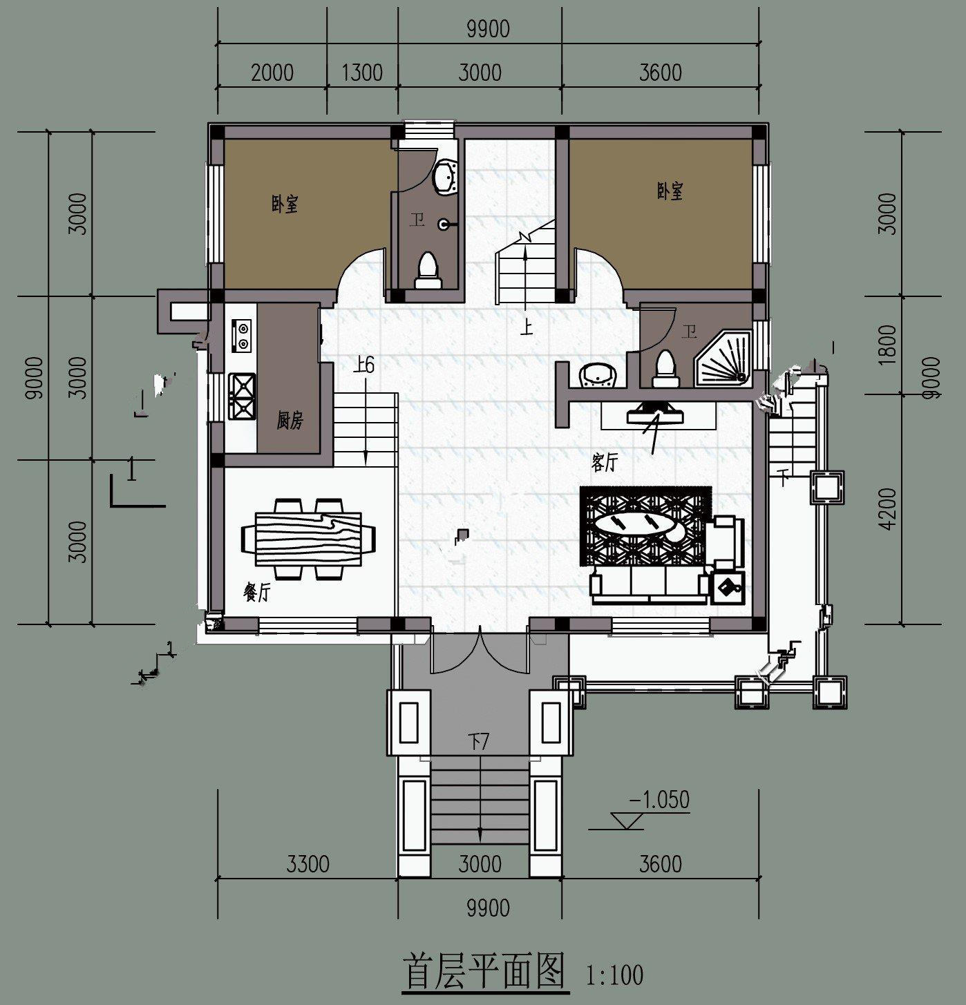 從一層平面圖上來(lái)看,入門(mén)處有幾層臺(tái)階,比地面高出一部分,下雨時(shí)水不會(huì)灌進(jìn)屋內(nèi)。過(guò)入室內(nèi),左手是餐廳,右手是客廳,餐廳在朝陽(yáng)的一面,比較亮堂,用餐時(shí)心情會(huì)更加愉悅。兩間臥室位于后方,休息時(shí)比較安靜。而且一個(gè)主臥帶獨(dú)立衛(wèi)生間,另外還有一個(gè)公共衛(wèi)生間,生活是比較方便的。