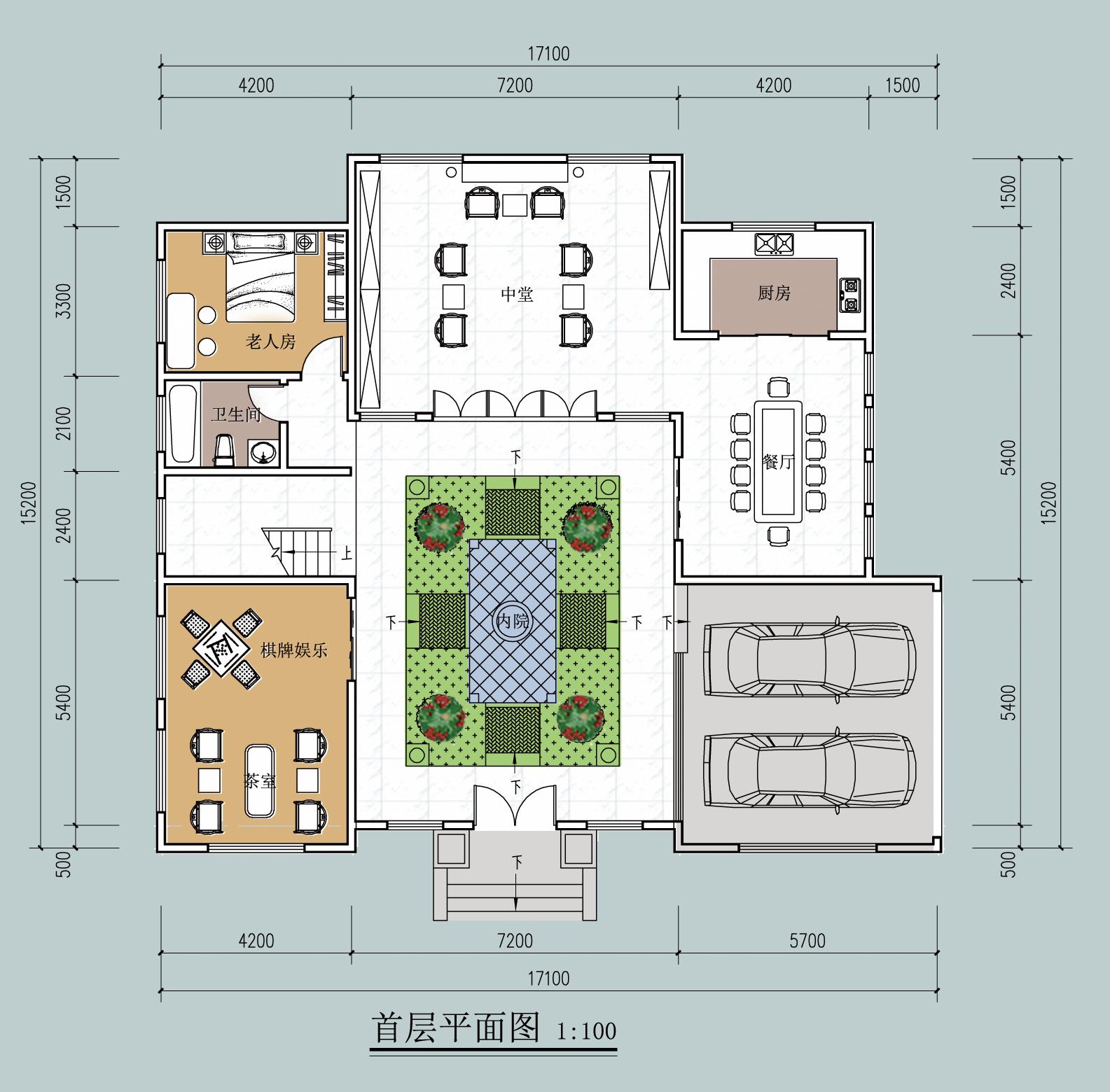 尺寸其實并不算很大,這樣的尺寸在被北方的話,基本都比這個要大一些。有可以放兩臺車的車庫,還是很爽的。進入大門,正對著中堂,兩邊的娛樂室,老人房,廚房和餐廳感覺 都那么和諧。
