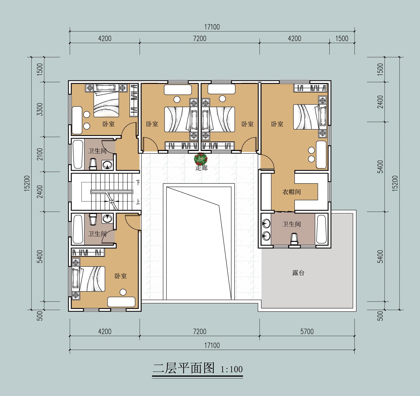 二層主要是五間臥室和大大的露臺,一家人應(yīng)該用不了,可以將多余的房間改成功能用房,娛樂室等。這個房型布局,如果家鄉(xiāng)有旅游景區(qū)的話,改為民宿也是相當不錯的。