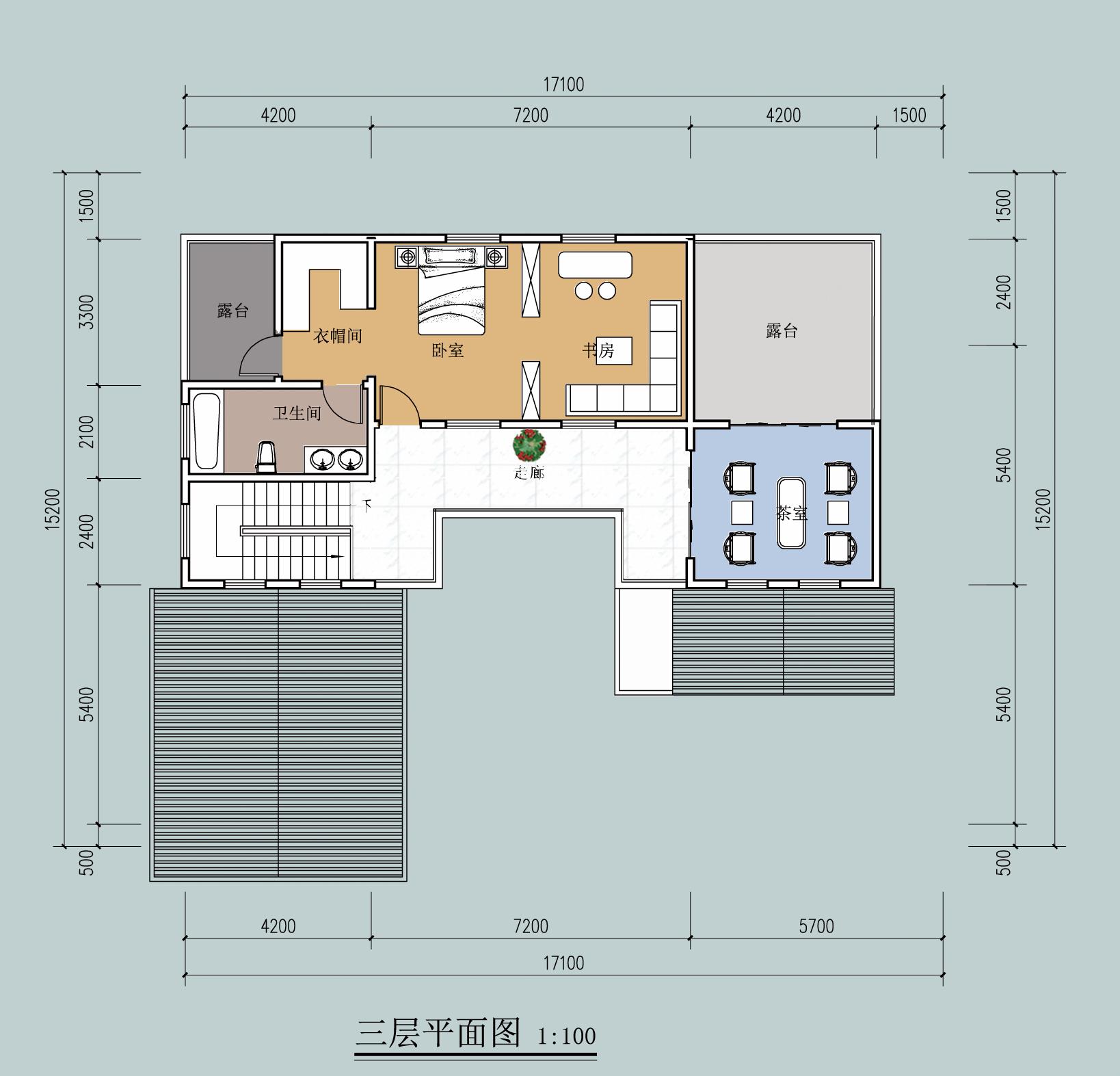 三層設(shè)計了衣帽間,臥室、書房、茶室和兩個露臺,總之生活是很方便的了。