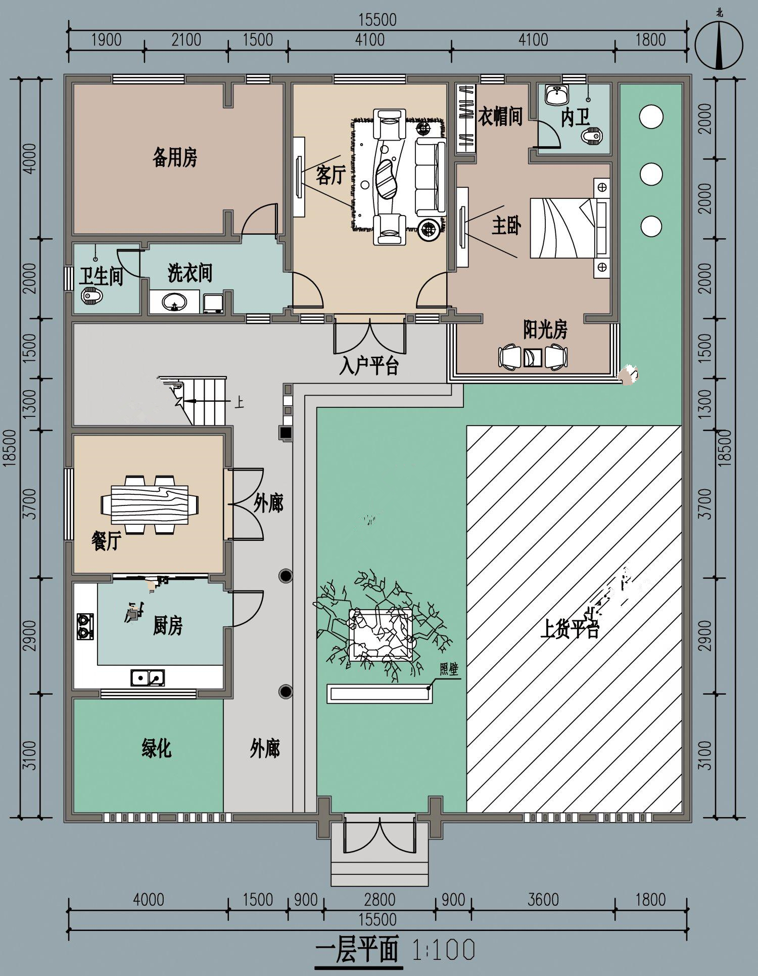 房屋布局呈“L"形,最右端的主臥寬敞舒適,與以往不同的是,這間臥室除了內(nèi)設(shè)衛(wèi)生間和衣帽間外,還連著專(zhuān)門(mén)的陽(yáng)光房,既接地氣,又舒服??蛷d左邊在客用衛(wèi)生間和洗衣間之外留了備用房,可做臥室也可作其它功能用房。餐廳和廚房拐過(guò)彎才能從外廊進(jìn)入,彰顯了大家富貴之氣。
