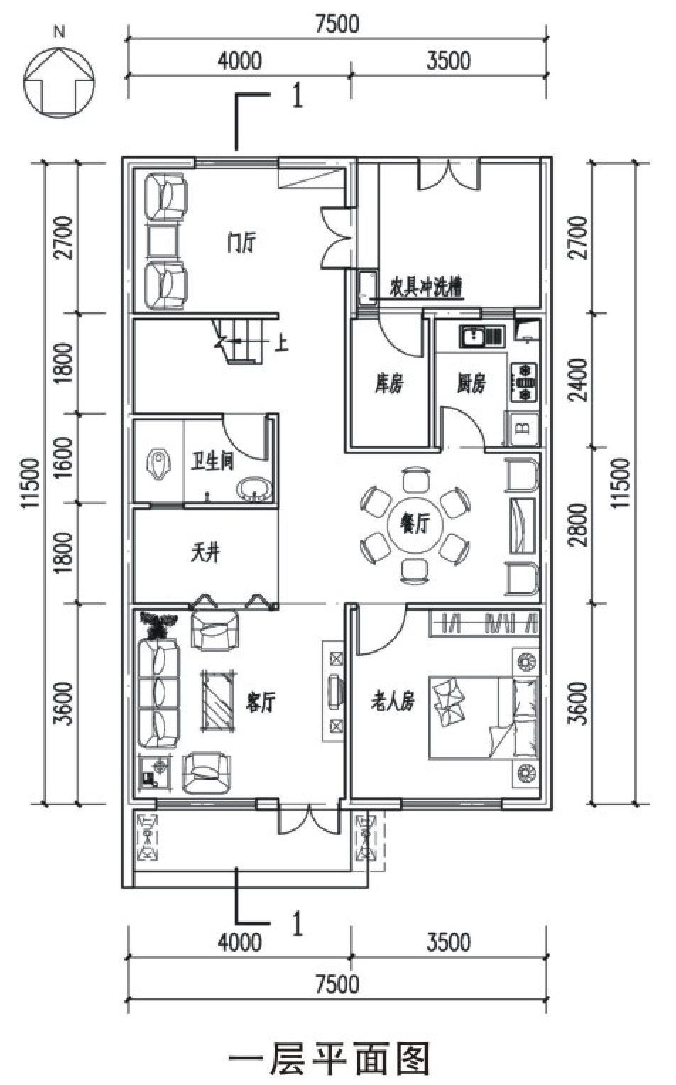 一層設有客廳、老人房、餐廳、衛(wèi)生間、庫房、廚房、門廳、農(nóng)具沖洗槽等。