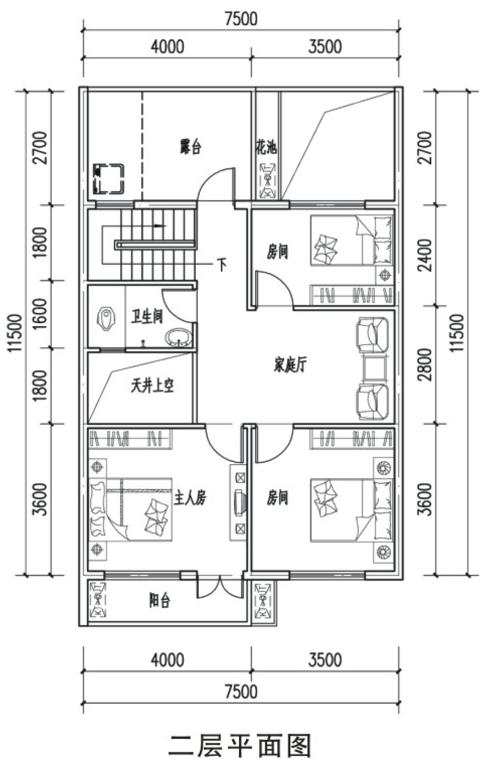 二層有3個臥室、1個衛(wèi)生間、一個家庭廳、1露臺、1陽臺、1花池,也就是我們常說的小型屋頂花園。