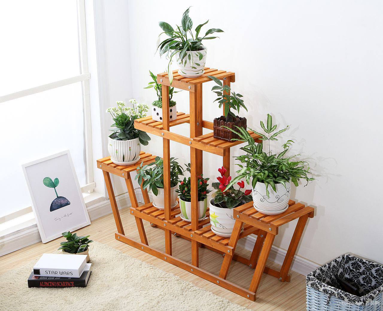 2、五層落地靠墻花架。它可以房子家里任何的角落,采用密度板,使用起來(lái)環(huán)保綠色,一般是咖啡色和白色兩種選擇,為家居裝修富有生機(jī)。
