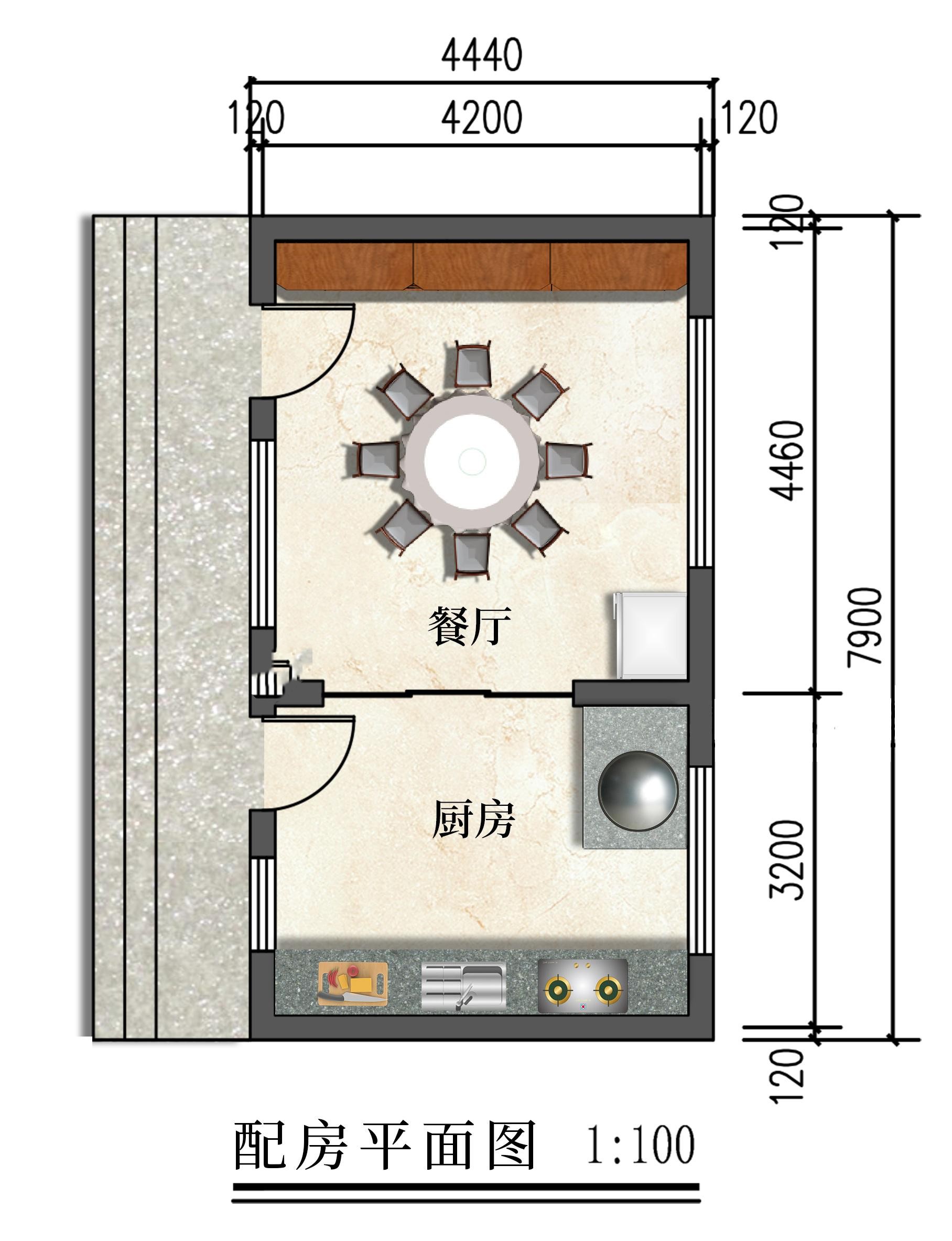 配房為餐廚區(qū)域,與客廳保持一定距離,避免油煙、污漬、噪音污染公共活動區(qū)域,居家生活更舒適。