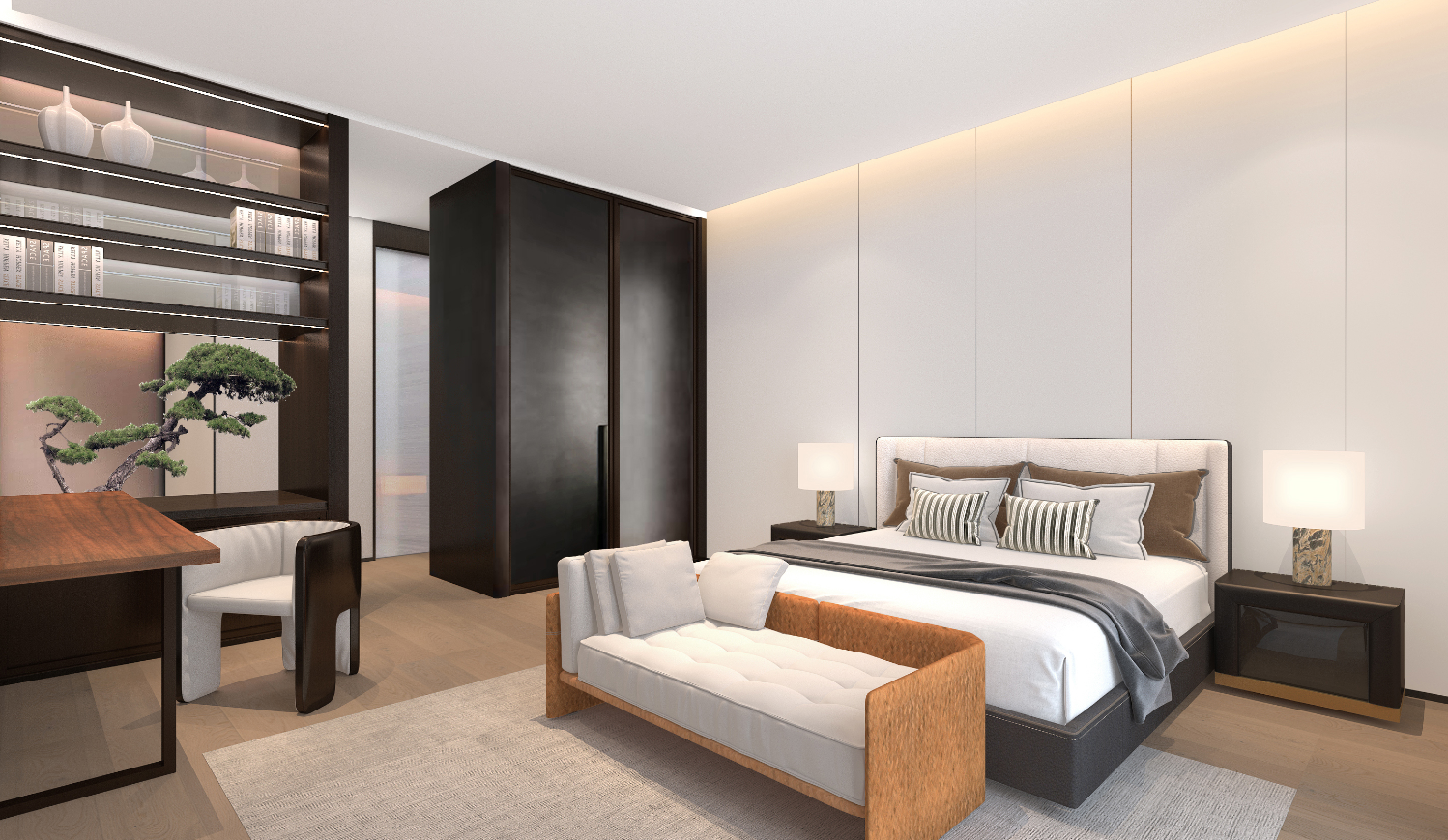 3.將臥房的一個角落裝扮成閱讀區(qū)也是很不錯的構(gòu)想,放上一個天天的書架以及書桌,規(guī)劃好各類家具的擺放整間臥房看上去都顯得更有層次感,也不會顯得空曠,同時這樣的設(shè)計還能方便回到家晚上的時候外理一些工作方面的事情。