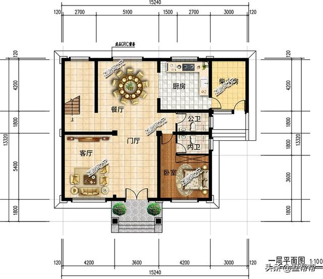 一層:客廳、臥室、2個(gè)洗手間、廚房、柴火房、餐廳