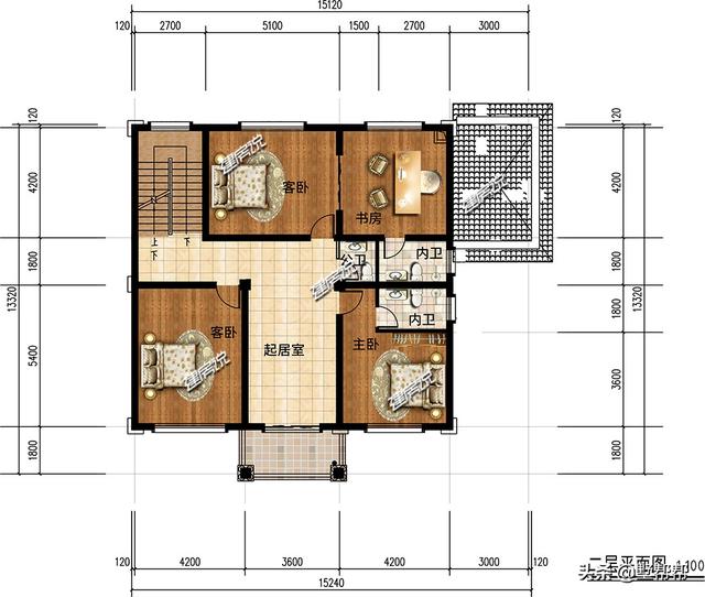 二層:起居室、3個(gè)臥室、書房、3個(gè)洗手間、陽臺(tái)