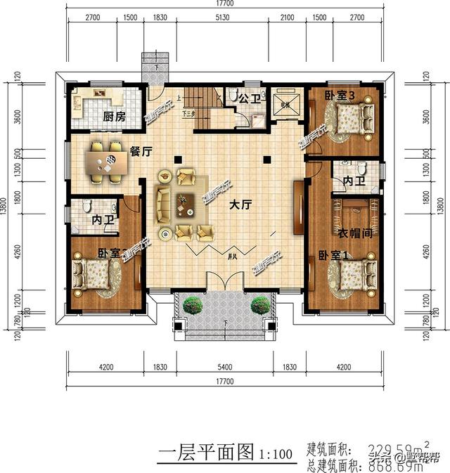 一層:客廳、3個(gè)臥室、3個(gè)洗手間、廚房、餐廳