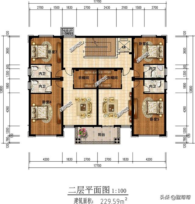 二層:2個(gè)客廳、4個(gè)臥室、2個(gè)衣帽間、4個(gè)洗手間、陽臺(tái)