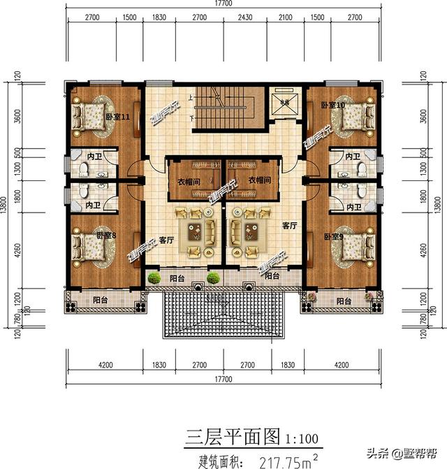 三層:2個(gè)客廳、4個(gè)臥室、2個(gè)衣帽間、4個(gè)洗手間、陽臺(tái)