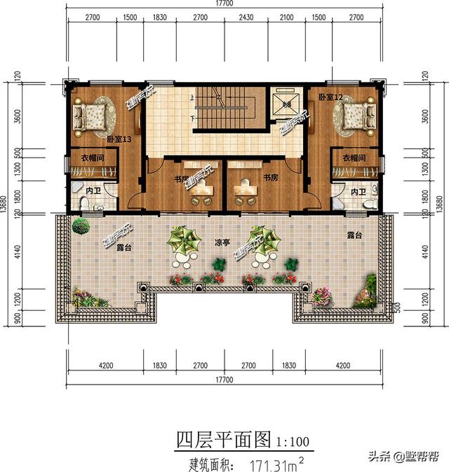 四層:2個(gè)臥室、2個(gè)書房、衣帽間、2個(gè)洗手間、露臺(tái)