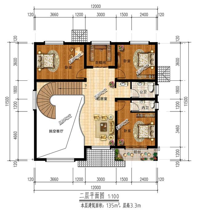 二層:起居室、3個(gè)臥室、衣帽間、2個(gè)洗手間、陽臺(tái)