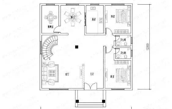 一 層:門廳、客廳(中空)、臥室(附衛(wèi)生間)、臥室、棋牌室、廚房、餐廳、衛(wèi)生間