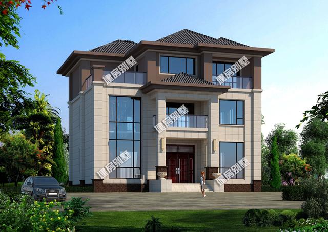 第二款是平頂花園風(fēng)格的三層戶型,部分屋面鋪蓋紅色釉面瓦,搭配主墻賣弄的白色面磚和真石漆,就顯得很高貴有型。但是如果換成斜屋頂,就有點(diǎn)“畫龍點(diǎn)睛”,“多此一舉”了。