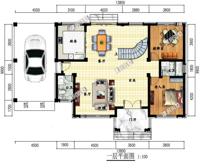 一層建筑高度3.3米,建筑面積183.1平,布局為:車庫,廚房、餐廳、老人房、棋牌室、客廳、門廳、公衛(wèi)、主衛(wèi)。
