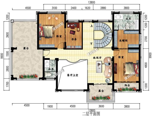 二層建筑高度3.0米,建筑面積159.26平,布局為:次臥室、書房、主臥+衣帽間+主臥+陽臺、公衛(wèi)、露臺。