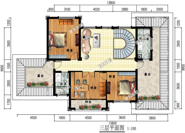 三層建筑高度2.7米,建筑面積113.06平,布局為:2臥室、書房、公衛(wèi)、陽臺、露臺。