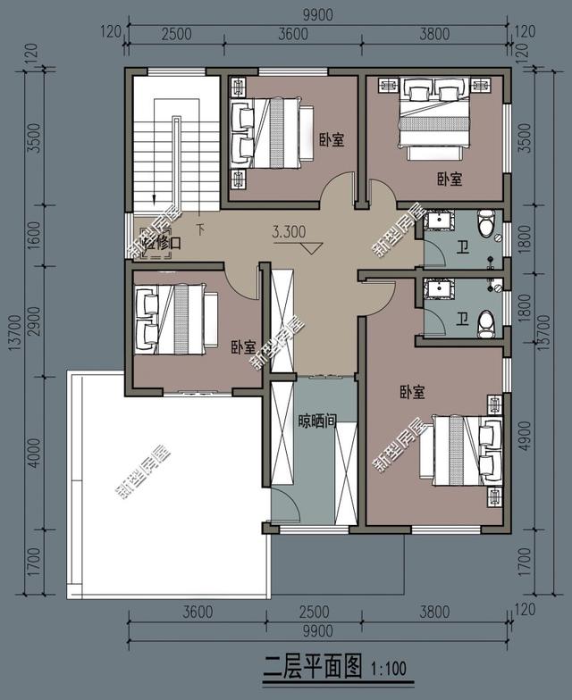 二層南立面設(shè)計(jì)一個(gè)晾曬區(qū),日常晾曬衣物更加干凈私密。車庫之上設(shè)計(jì)一個(gè)大露臺,豐富家人的休閑娛樂生活。