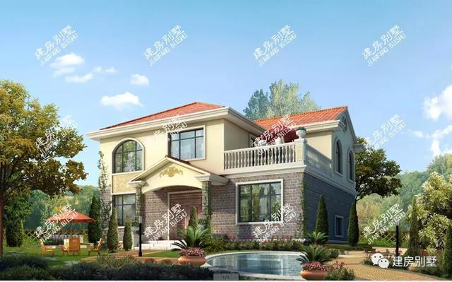 第二棟:12×10米,磚混結(jié)構(gòu),主體造價(jià)也只要20多萬,這款戶型受歡迎還有一個(gè)原因就是尺寸比較好,墻面用面磚、真石漆搭配浮雕裝飾,屋面蓋瓦。