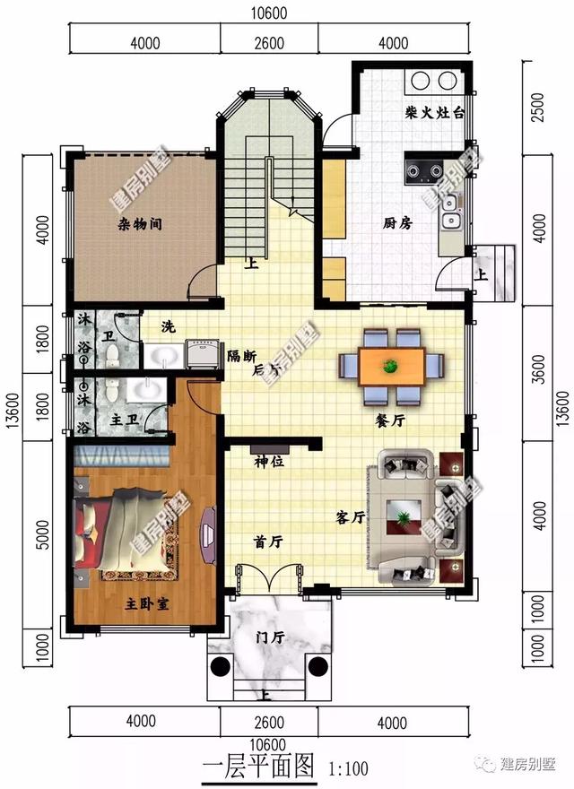 一層布局圖:配有小堂屋,一間帶主衛(wèi)的老人房,挑空的客廳和雜物間,樓梯處使用多邊形窗,這塊區(qū)域采光很好,窗內(nèi)設(shè)土灶房,側(cè)開門通透性很好。