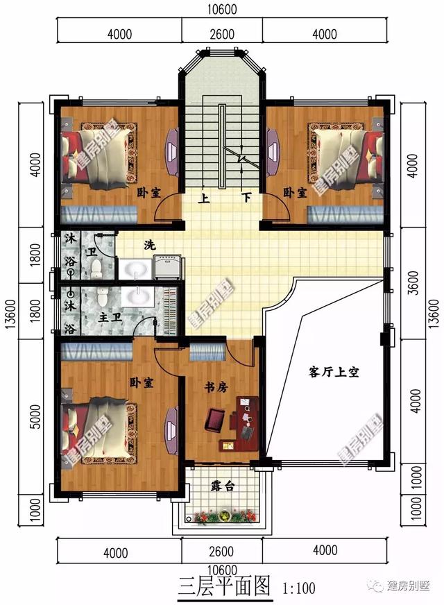 三層布局圖:配有三室一廳兩衛(wèi),主臥帶獨(dú)衛(wèi),還有書房和休閑棋牌室,都是做成開放式的,也可以在后期裝修過程中進(jìn)行裝修隔開,室外配生活陽臺。