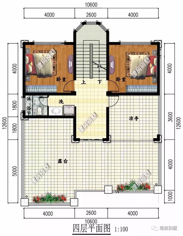 四層布局圖:配有兩間臥室,室外有大露臺和觀景涼亭。