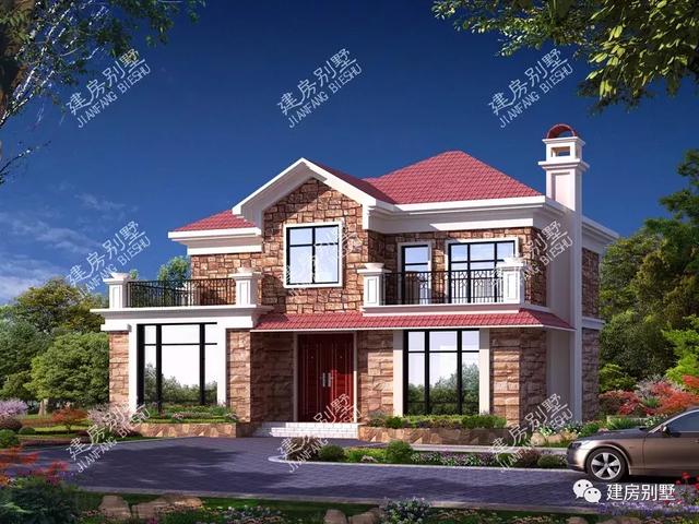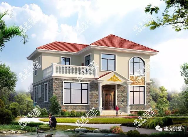 第二棟別墅:13.4×11米,磚混結(jié)構(gòu),主體造價(jià)25萬左右,這款戶型的外觀非常漂亮,墻面用文化石和少量真石漆裝飾。