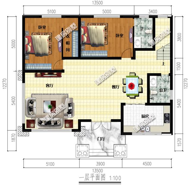 一層設計2臥室、廚房、餐廳、客廳、公衛(wèi)、主衛(wèi)、門廳、衣帽間。