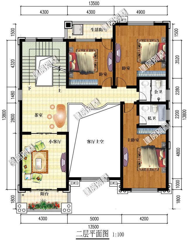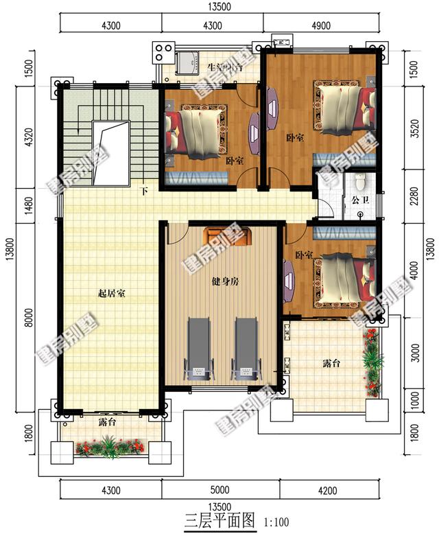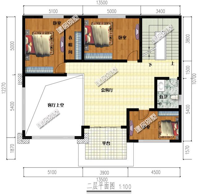 二層設計3臥室、公衛(wèi)、會客廳、平臺。