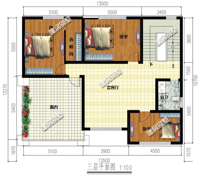 三層設計3臥室、露臺、會客廳、公衛(wèi)、衣帽間。