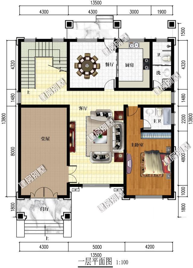 一層設計堂屋、主臥+主衛(wèi)、客廳、廚房、餐廳、公衛(wèi)。