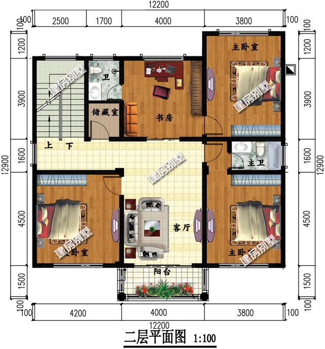 二層設(shè)置4臥室、公衛(wèi)、主衛(wèi)、客廳。