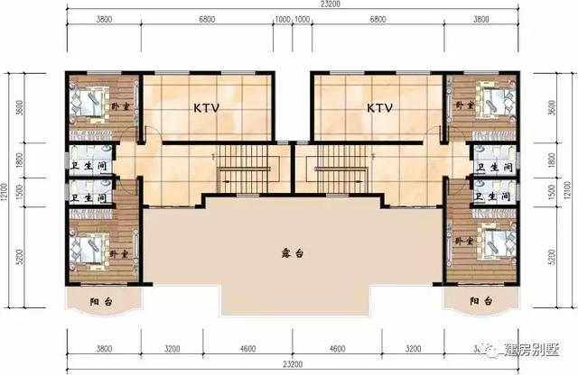 室內(nèi)平面圖:首層每戶都配有一個(gè)帶獨(dú)衛(wèi)的主臥室和一間次臥室,公衛(wèi)和私衛(wèi)是靠著的,客廳挑空較寬敞,使用雙跑直角樓梯設(shè)計(jì);二層設(shè)有一間主臥室和三間次臥室,可以把其中一間拿出來做書房;三層有兩間臥室設(shè)計(jì),配一個(gè)家庭式KTV和較大的室外觀景晾曬露臺(tái)。