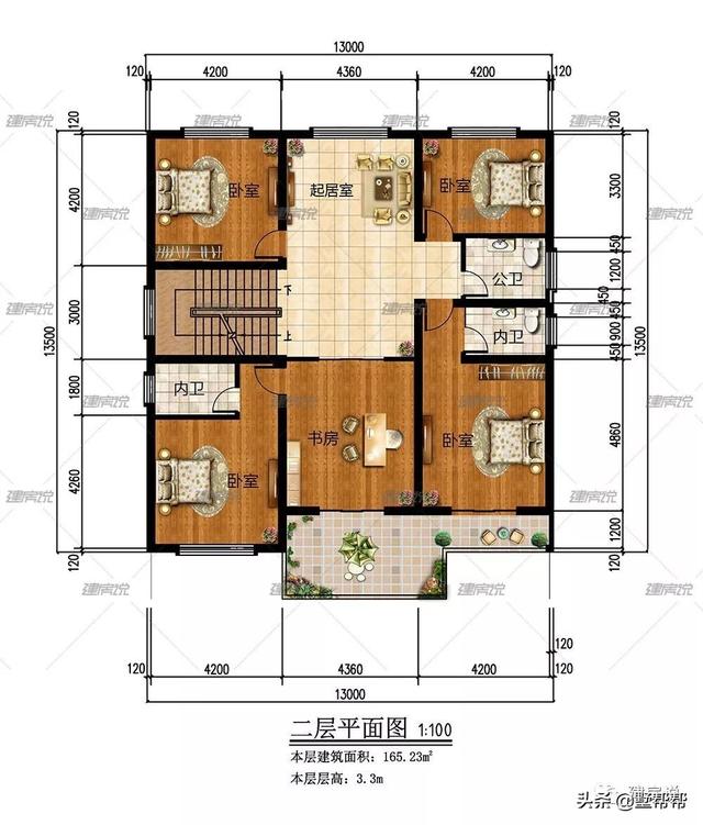 二層:設有4間臥室,主次分明;設有起居室,方便家人之間聯(lián)絡;設有書房,閑時看書修身養(yǎng)性。