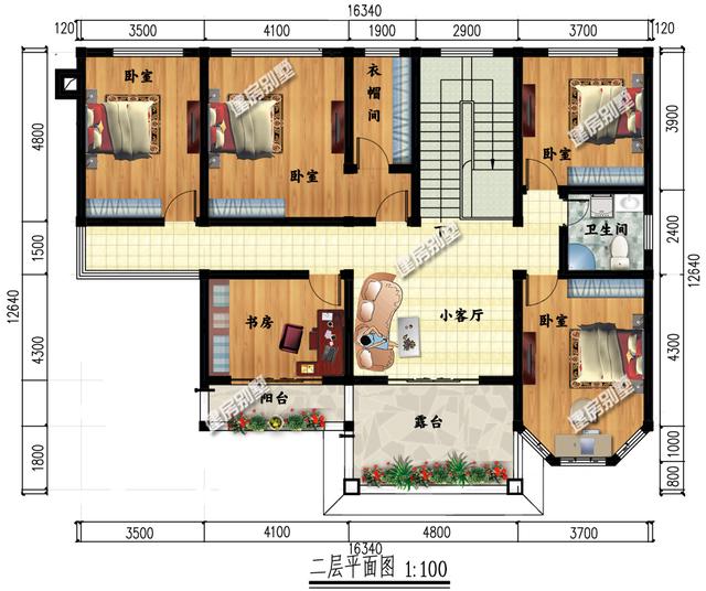 二層設(shè)計(jì)4臥室、書(shū)房、衣帽間、小客廳、公衛(wèi)、露臺(tái)。