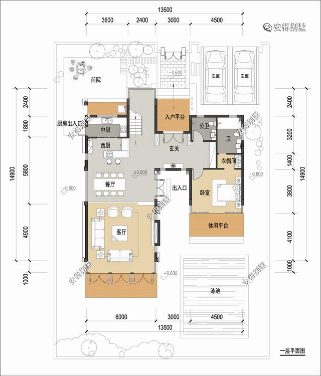一層有公共的廚房、餐廳和豪華大客廳,流線清晰,布局寬敞舒適,透過落地大窗看到庭院美景,真是一種生活的享受。
