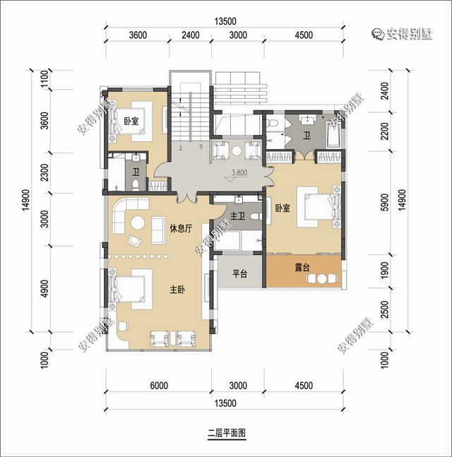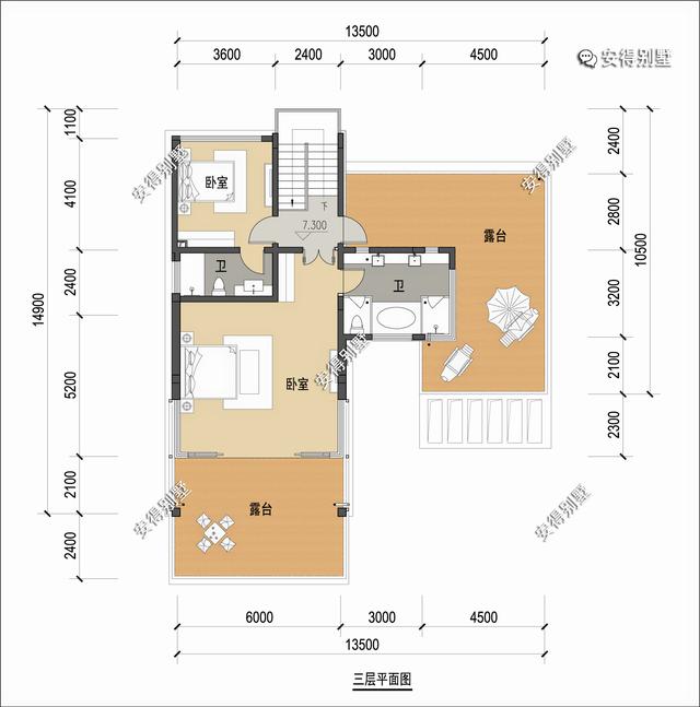 本棟別墅共3三層,一共有6間臥室套房,每間客房臥室還有私人的休閑露臺,落地大窗戶。