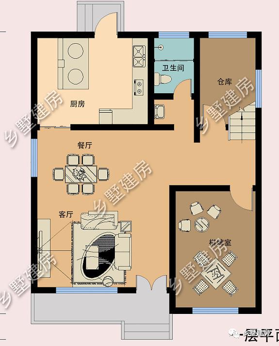 設(shè)有:客廳、棋牌室、廚房、餐廳、倉庫、公衛(wèi)。一層入戶前是一個走廊,入戶后是一個客廳,供家人娛樂,開式式餐廳,視覺上更開闊。右側(cè)是一個獨立的大棋牌室,打牌也不影響家人。北面大廚房里,設(shè)計了雙灶臺,更符合農(nóng)村朋友的生活習(xí)慣。衛(wèi)生間干濕分離。樓梯下,合理設(shè)計了倉庫,可以存放家里的閑置物品,家里更整潔干凈。