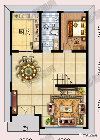 一樓的右邊是一個客廳和一間臥室,臥室可以作為老人房。左邊是廚房和餐廳,平時用餐很方便。還有一間公衛(wèi),衛(wèi)生打掃起來也非常方便。