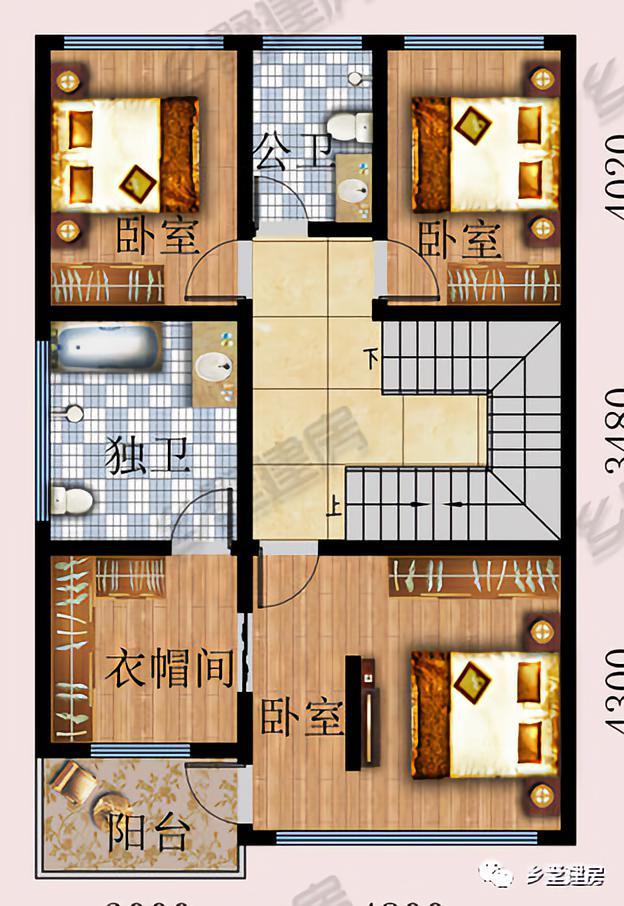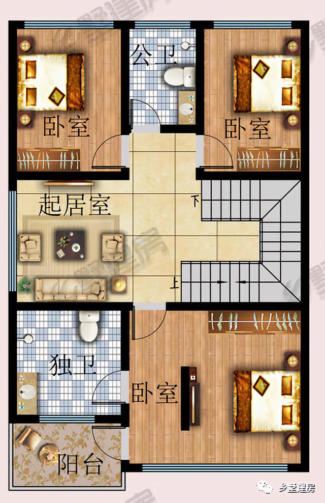 二樓為居住區(qū)。北面共有倆間臥室和一間公衛(wèi),家里人口多的比較適合多臥室。樓梯上來處是起居室,南面則是一間帶陽臺的套房,每天早上醒來就可以看見陽光。