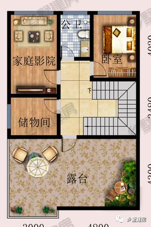 四樓上樓梯之后是一個儲物間,便于雜物的放置。隔壁就是一間家庭影院,飯后閑來無事可以一家人一起在這里看電影,不用特意跑去市里,真是棒極了!右邊則是一間臥室和公衛(wèi)。四樓南面是一個大露臺,露臺的好處實(shí)在是太多了,這款小面寬四層別墅簡直就是一個驚喜!