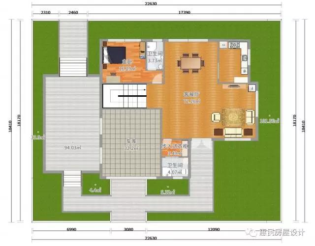 一層室外設(shè)有人行路,連接車庫和花園各處,進(jìn)門后客廳占地面積較大,廚房獨立,避免了油煙和濕氣彌漫到客餐廳,同時有一間套房和一個用步入式衣柜的公共衛(wèi)生間;二層設(shè)有一間主臥和兩間客臥,外加一間書房,客廳面積與一樓接近,連接著室外的花園露臺,同時可從露臺登梯直上屋頂。