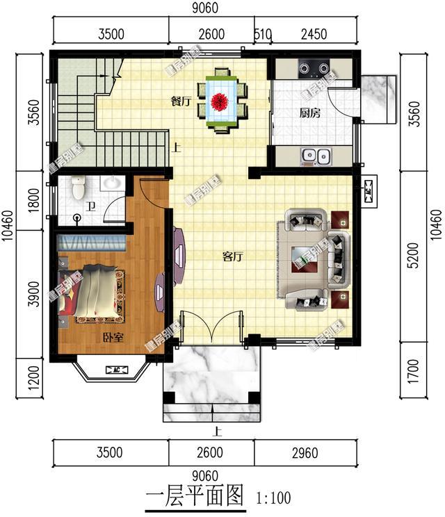 一層布置主臥+主衛(wèi)、公衛(wèi)、客廳、門廳、廚房、餐廳。