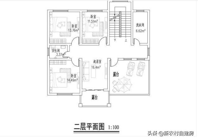 二層:起居室【附露臺(tái)】、3臥室、洗衣間、露臺(tái)、衛(wèi)生間