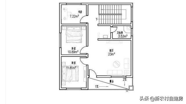 二層: 客廳、2臥室、書(shū)房、衛(wèi)生間、露臺(tái)